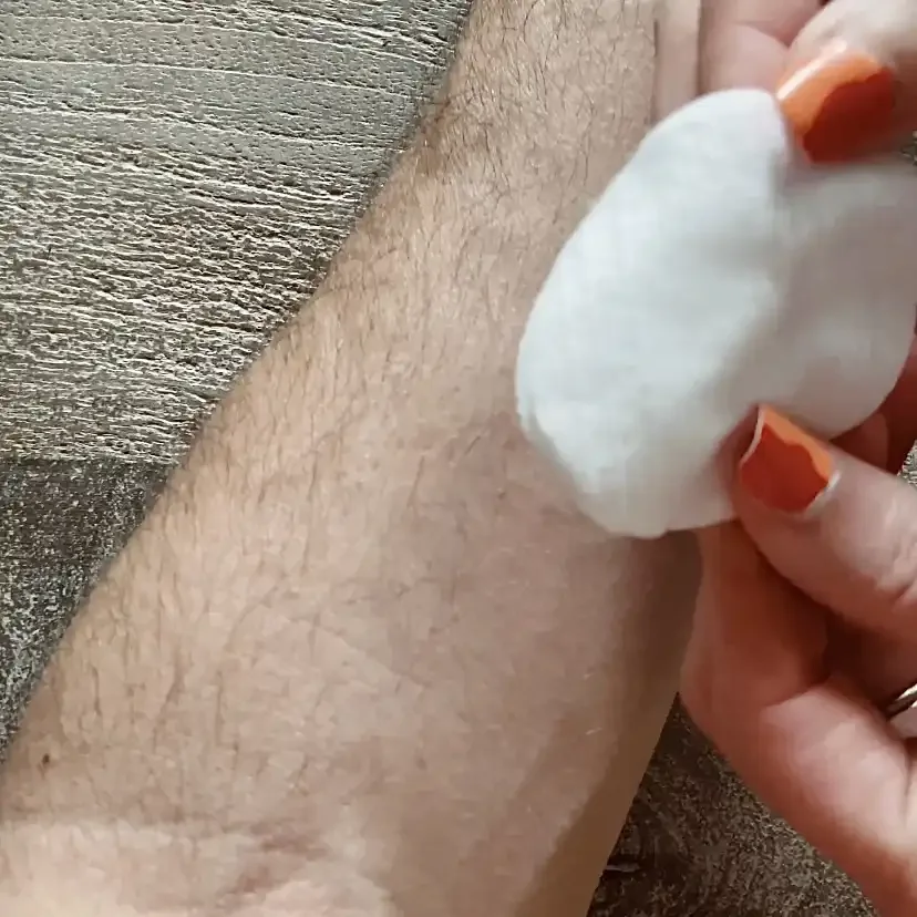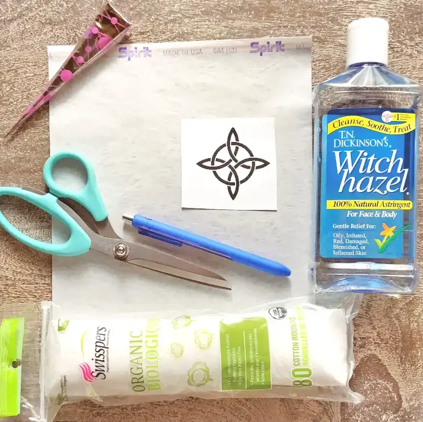 Next, saturate the cotton with your witch hazel (or rubbing alcohol) and wipe down all of the skin where the design will go. You want to leave the skin with a nice sheen so that it’s a little damp but not wet. If it’s too wet, let it air dry for 5-30 seconds until it’s just damp.