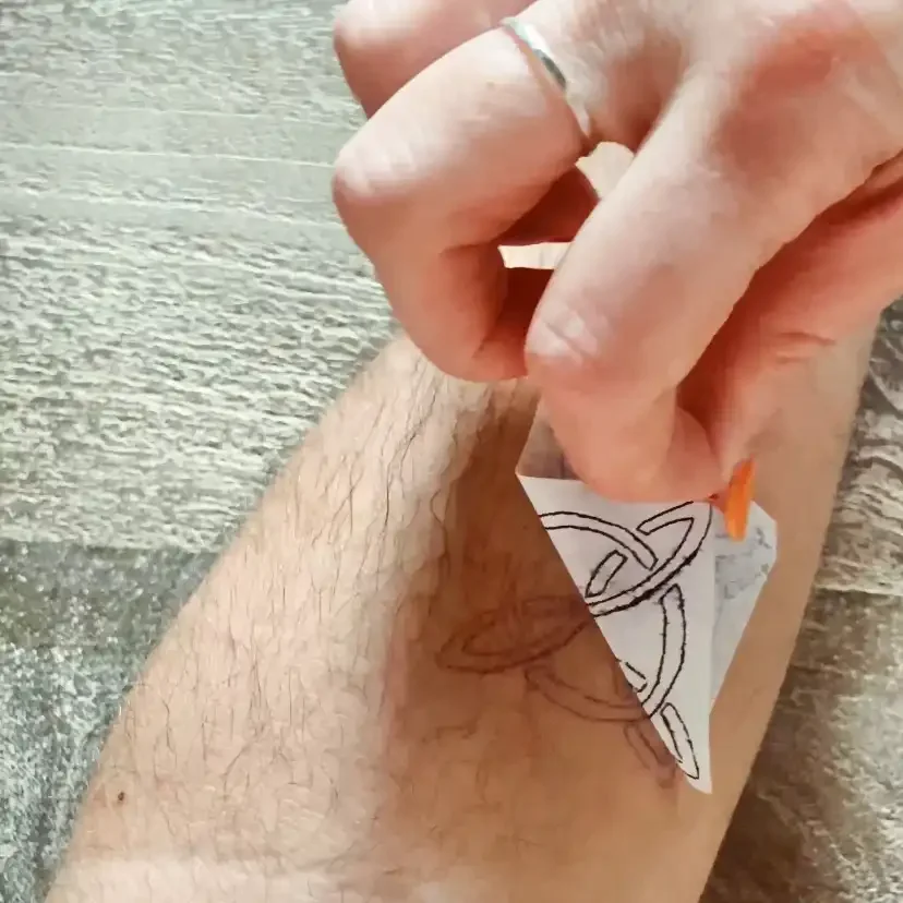 Carefully place the transfer, ink side down, onto the skin. Gently press it in place so it’s fully stuck down.