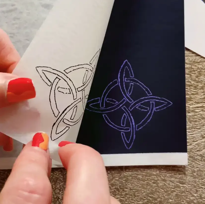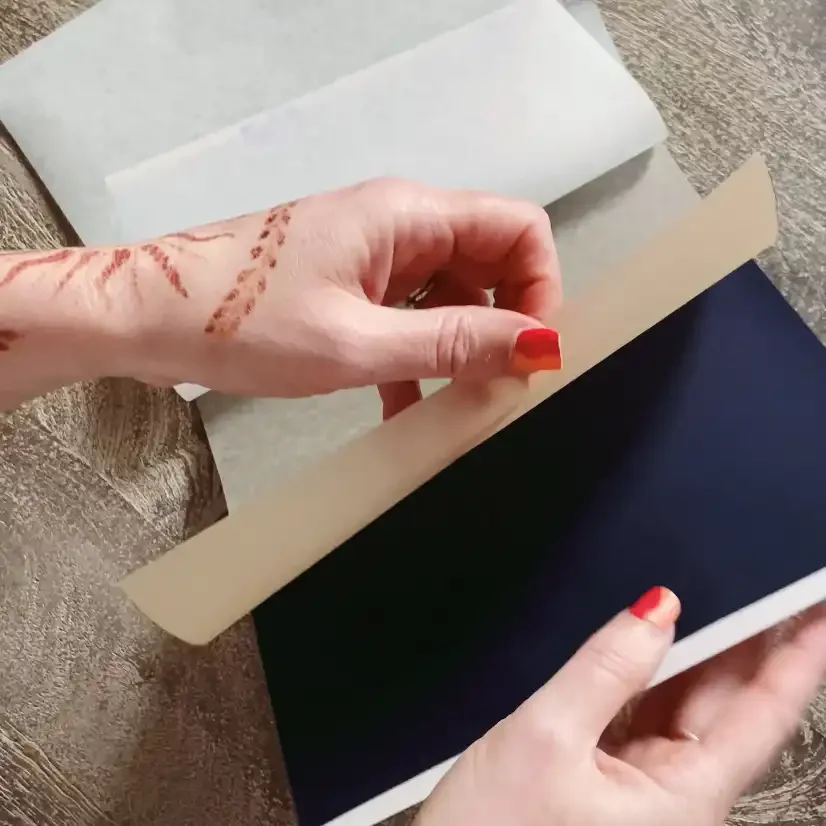 You’ll notice the transfer paper has 3 sheets. The top white tissue paper sheet, a brown center sheet and then a thick dark-blue ink sheet.